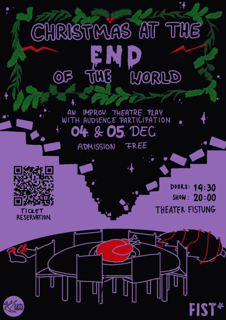 This December, dive into the Arts Lib Improv Theatre Extravaganza “Christmas at the End of the World”. There will be audience participation galore so prepare to exercise your creative muscles!